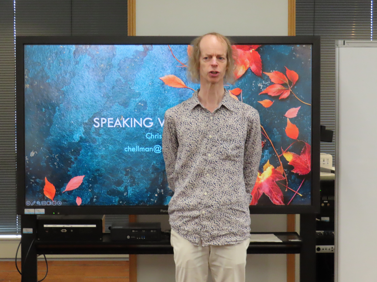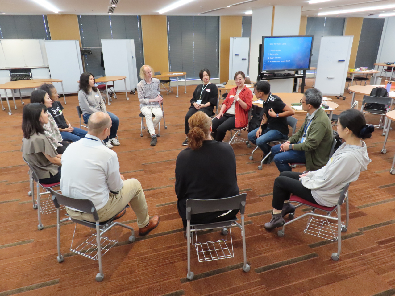 本研修は、今年度実施される英語スキルアップ研修の第2回目で、立命館大学 言語教育推進機構 講師のChristopher Hellman先生を講師にお迎えし、国際学会などの学術的な場面で求められる基礎的な口頭コミュニケーション能力の向上を主な目的として実施しました。