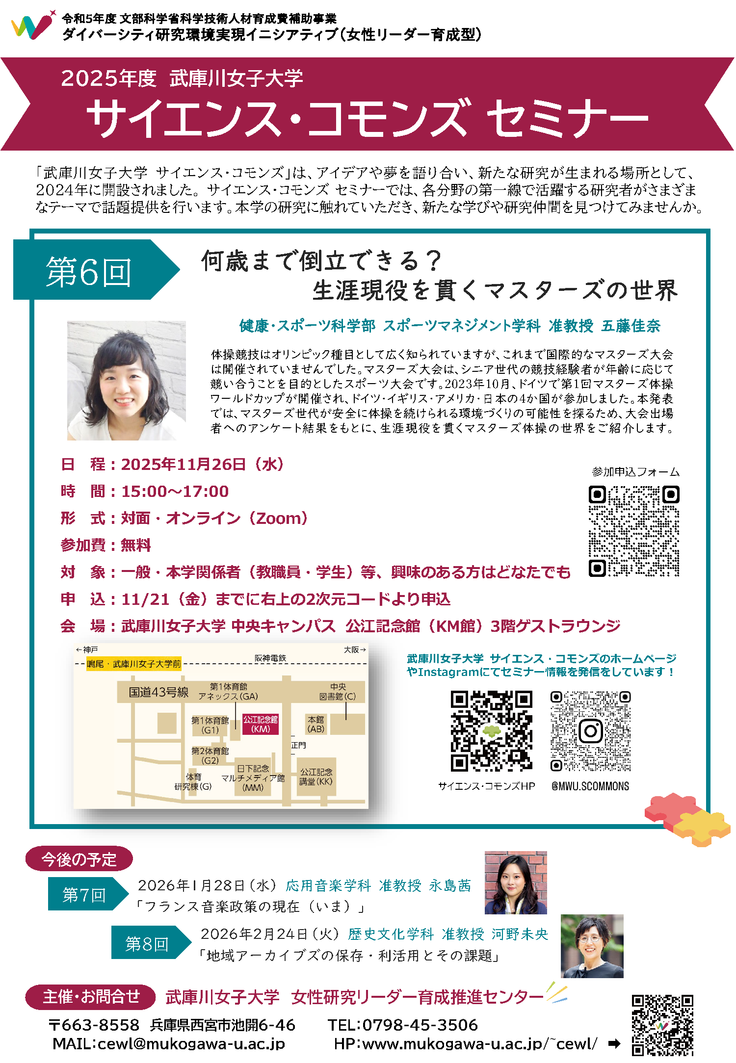 | 女性研究リーダー育成推進センター 0798-45-3506(内線2962、2963、2964、2965) cewl@mukogawa-u.ac.jp |