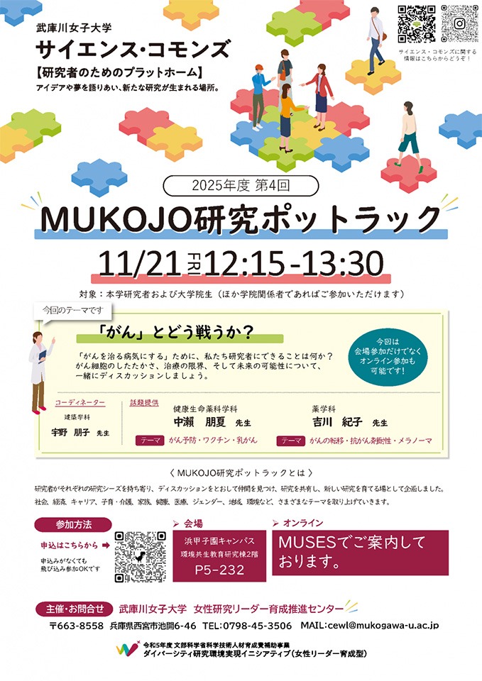 | 話題提供 | 健康生命薬科学科 中瀨 朋夏 先生 (テーマ:がん予防・ワクチン・乳がん) 薬学科 吉川 紀子 先生 (テーマ:がんの転移・抗がん剤耐性・メラノーマ) |